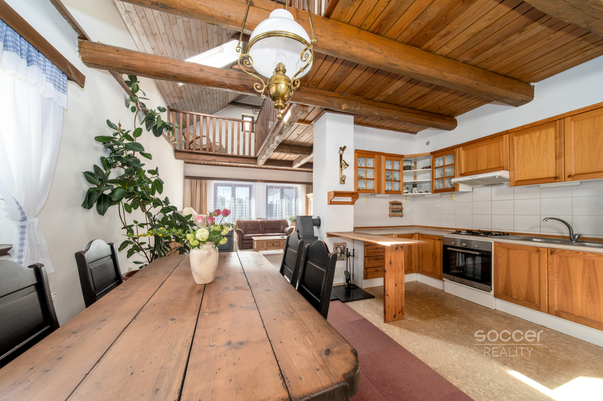Samotný nenápadný dům vás okouzlí mimořádně útulným zázemím. Je vybaven stylovým nábytkem, který ladí s duchem místa. Dispozičně je řešen jako 3+kk, plus velká obytná galerie. Najdete zde vstupní chodbu s masivním schodištěm a dvě koupelny (jednu v přízemí a druhou v podkroví). Na obytnou galerii vede schodiště také přímo z hlavního obytného pokoje. Ten je plynule propojen s kuchyňským a jídelním koutem. Interiér mile překvapí atypickým řešením a jedinečnou atmosférou.