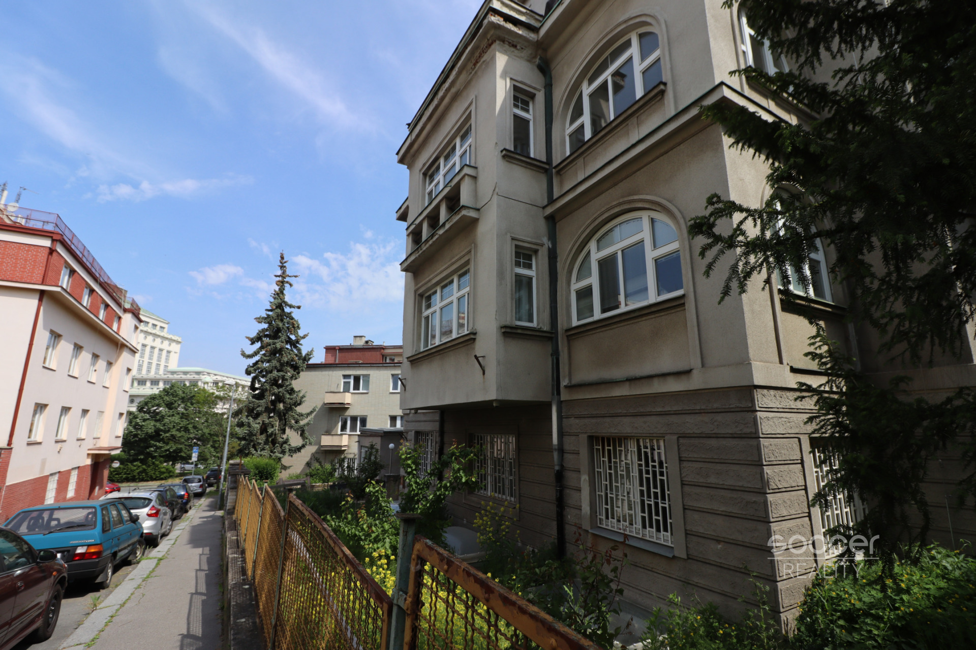 Balkon je přístupný z obývacího pokoje, má jižní orientaci a je ideálním místem pro ranní kávu nebo večerní relax. Dům se nachází v klidné ulici, přesto s vynikající dopravní dostupností – tramvají se dostanete do centra během několika minut, stanice metra B Karlovo náměstí je dostupná přibližně za 5 minut.