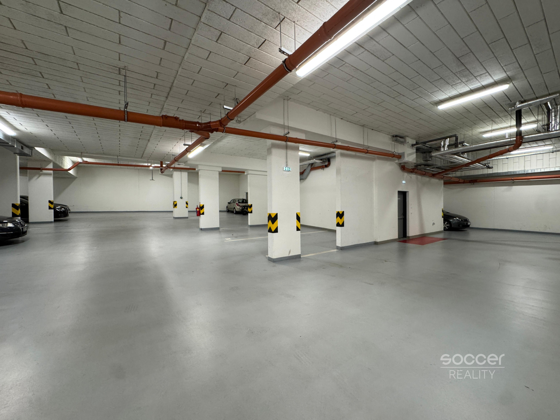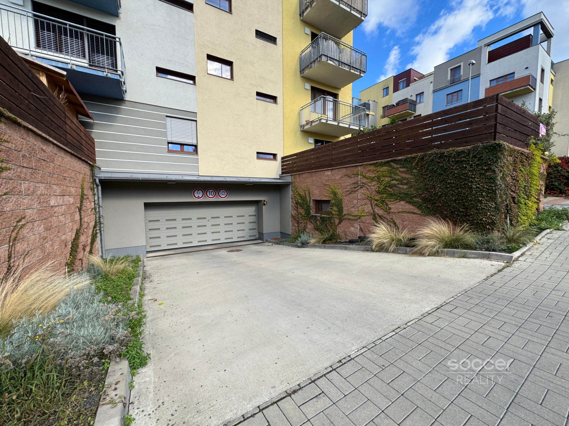 Stání se nachází v prostorných a čistých podzemních garážích s pohodlným vjezdem na dálkové ovládání. Výška vjezdu 2 m. Parkovací stání 3x5 m.