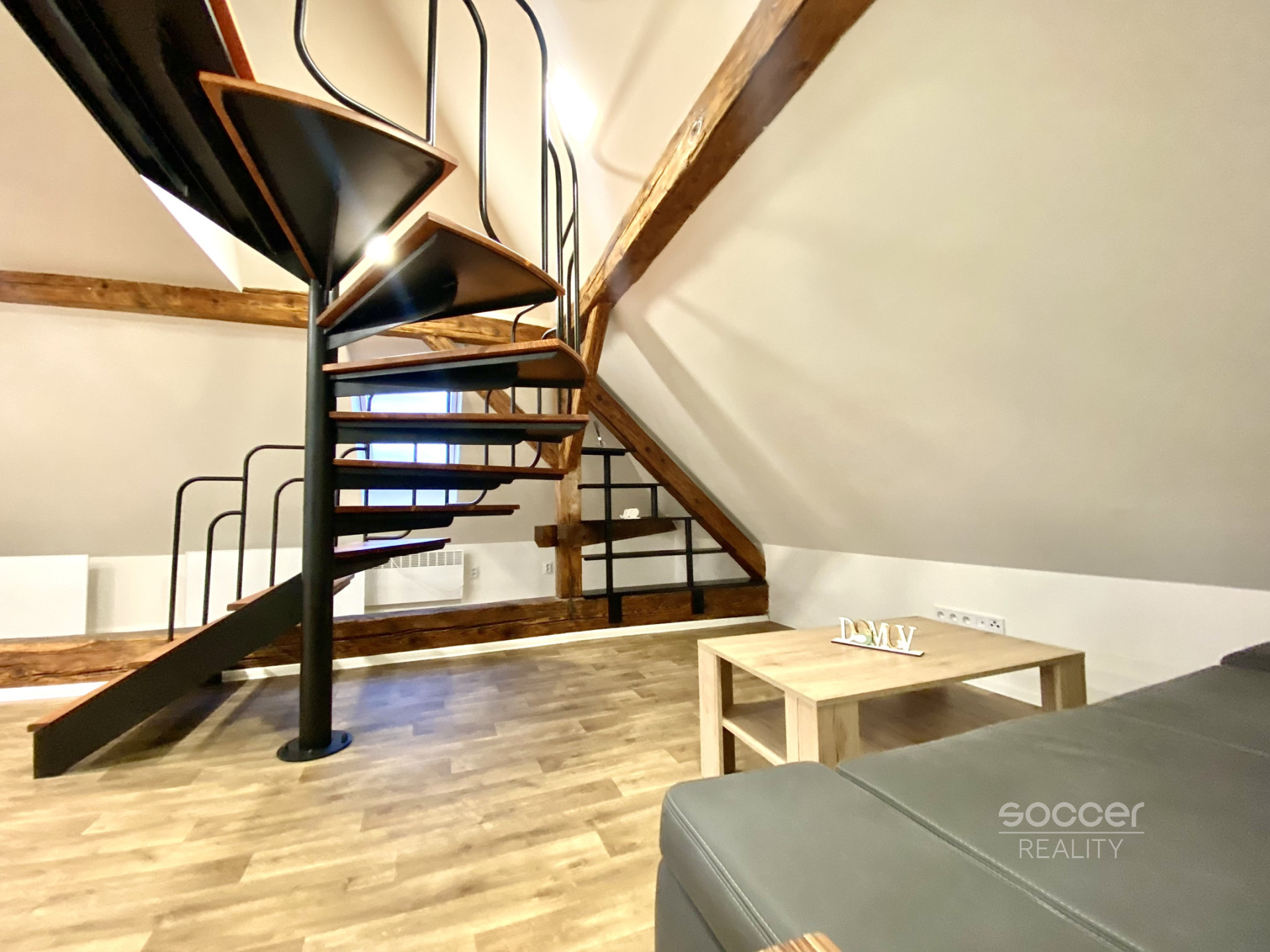 Atypický ateliér, řešený jako velkorysé 1+kk+vyvýšené patro ve stylu mezonetu, je z velké části vybavený a nachází se v podkroví udržované vily s rodinnou atmosférou. Interiér se zachovanými původními dřevěnými prvky, masivním schodištěm jako stylovou dominantou a okouzlujícími výhledy do údolí Jizery i na zříceninu hradu Zvířetice, vytváří v každé denní době kouzelnou atmosféru.