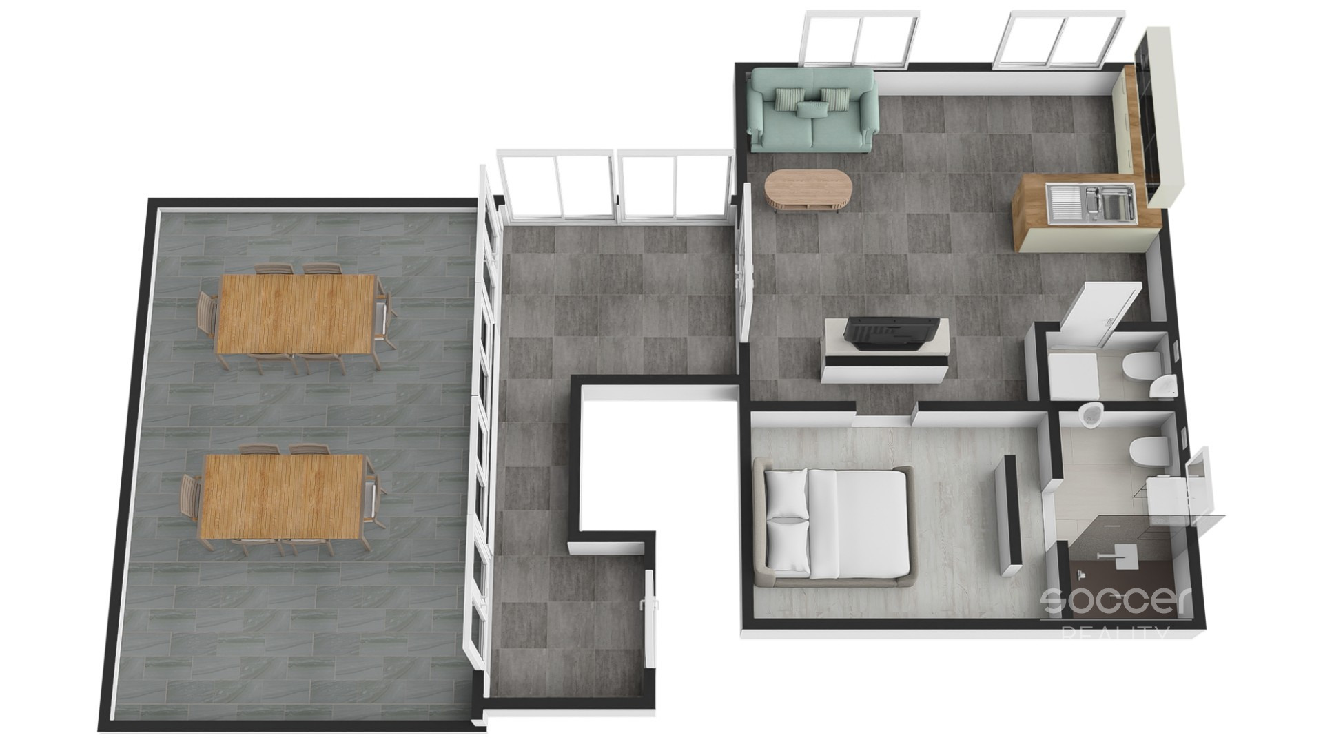 Na obývací pokoj navazuje krytá terasa 12,2 m2 a na ni terasa 32,2 m2, obě terasy jsou pouze pro byt.