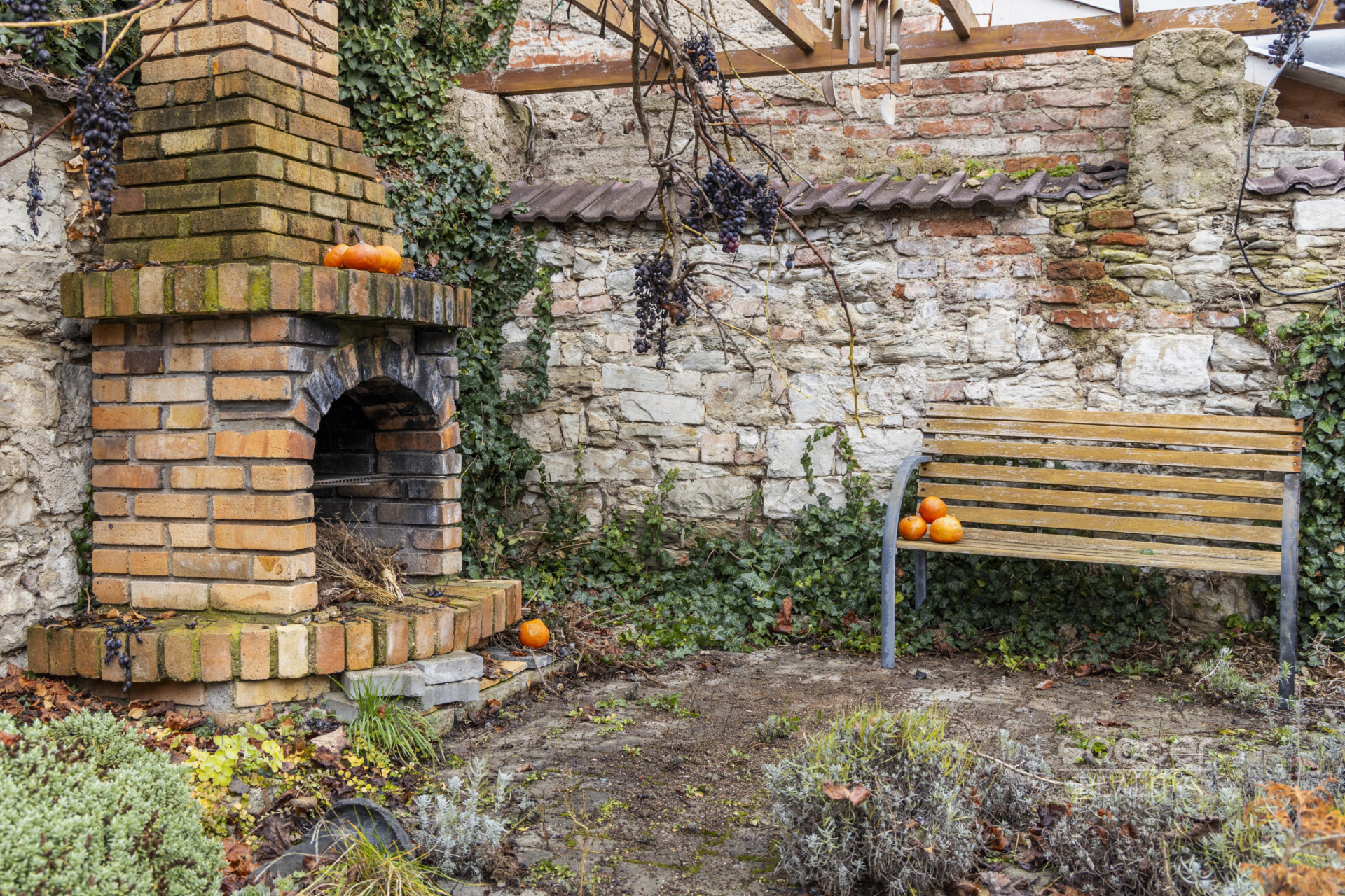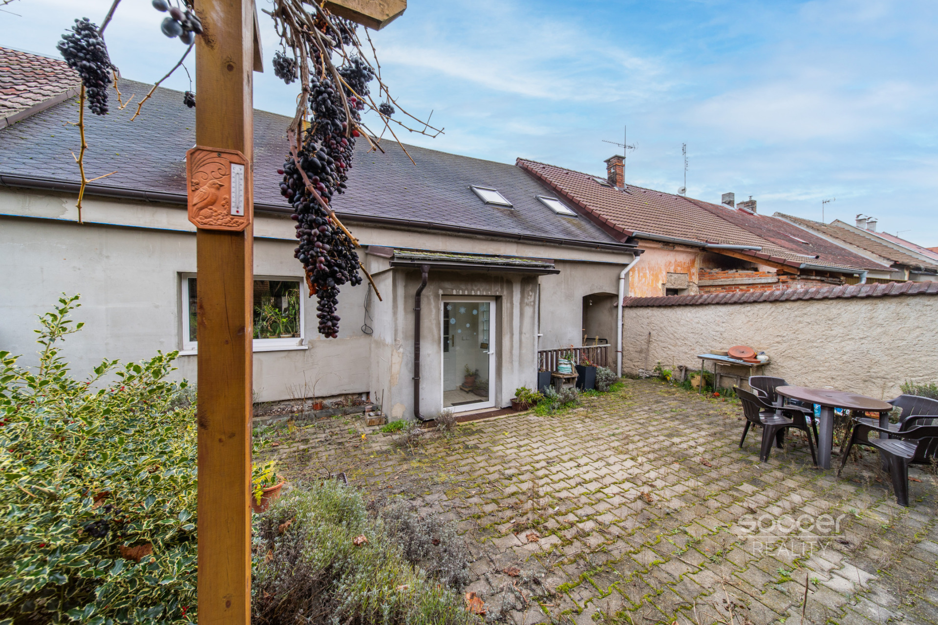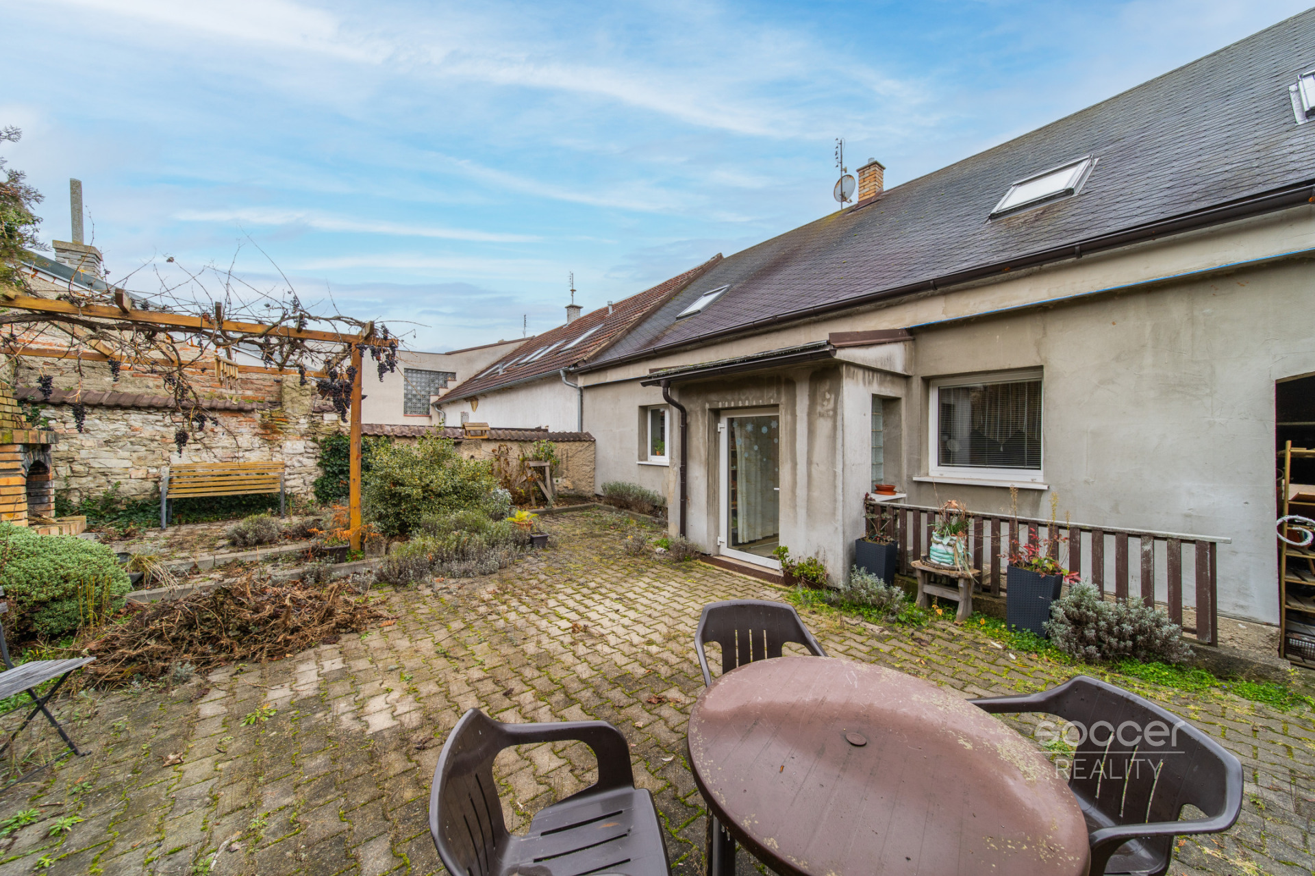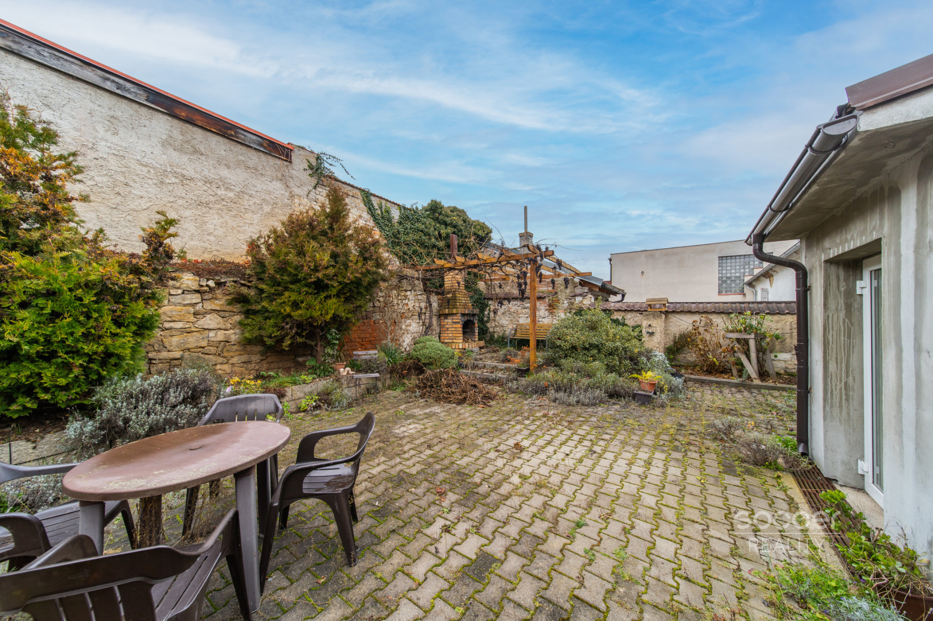 Dům je částečně podsklepený. Celý dvůr je upraven moderní šedou zámkovou dlažbou. Kolem domu se nachází vysoká opuková zeď, která dodává nejen osobitý charakter, ale především soukromí a bezpečí. Parkování je možné přímo u domu.