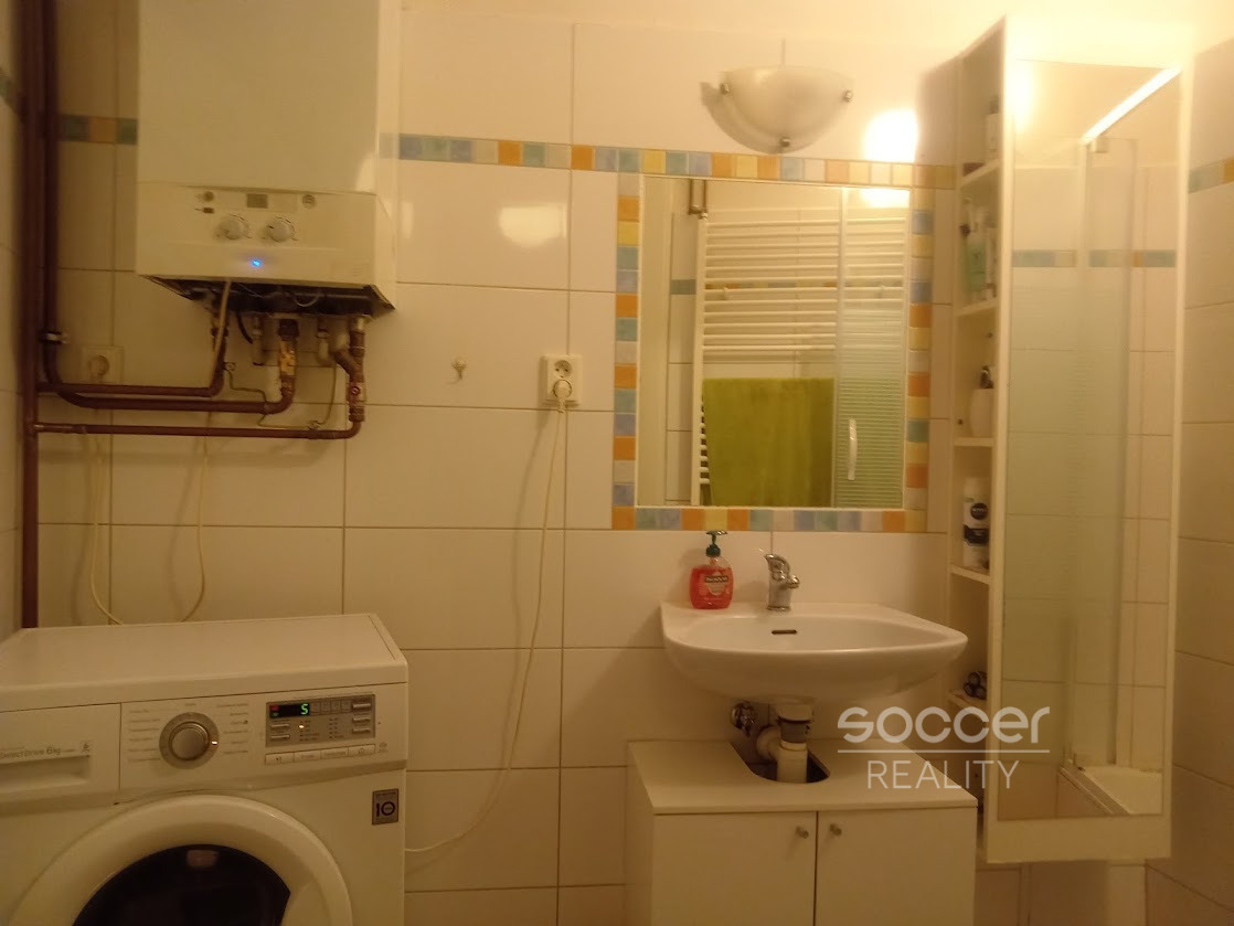 Koupelna je vybavena sprchovým koutem a pračkou. WC je samostatné.