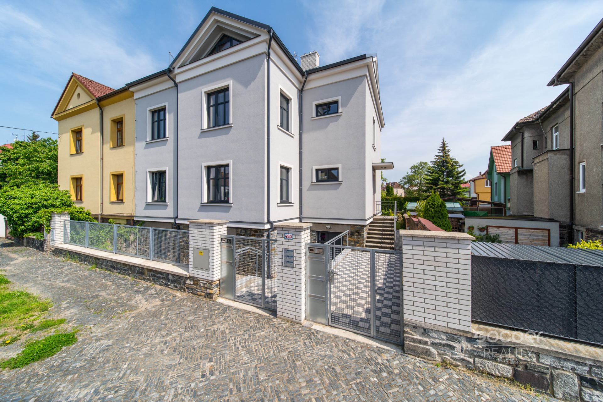 Celá nemovitost je po velmi zdařilé a vkusné rekonstrukci, zachovává vzácné původní prvky, důraz je kladen na celkovou souhru s jedinečnými designovými detaily. Samotný byt je plně zařízený a nabídne vám velký obývací pokoj s vybaveným kuchyňským koutem a krbovými kamny. Další pokoj je neprůchozí a budete z něho mít výhled do udržované zahrady, stejně jako z ložnice s velkým francouzským oknem. Dvě prostorné koupelny vám umožní volbu mezi sprchovým koutem a vanou. Interiér je světlý a vzdušný a budete mít navíc možnost pobývat v soukromí zahrady náležející k vile.