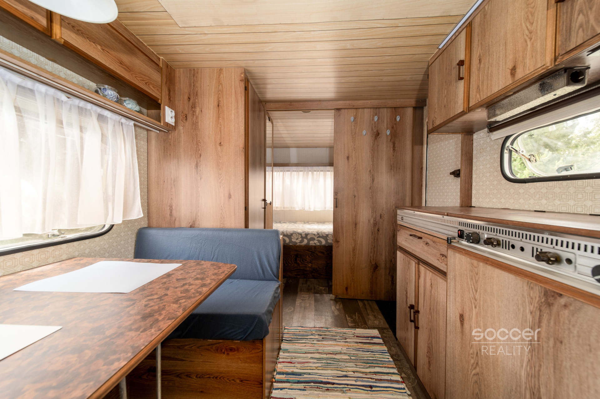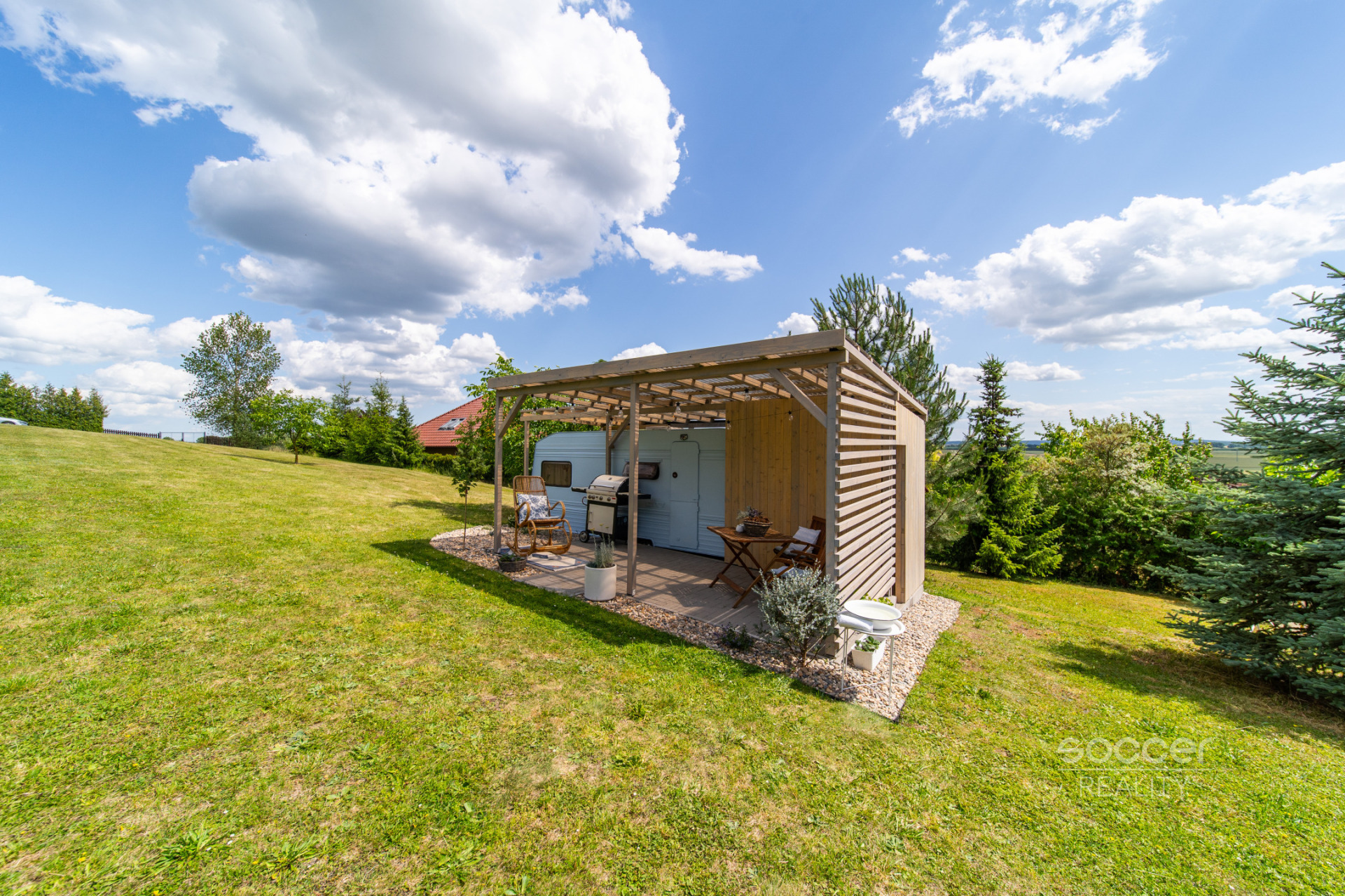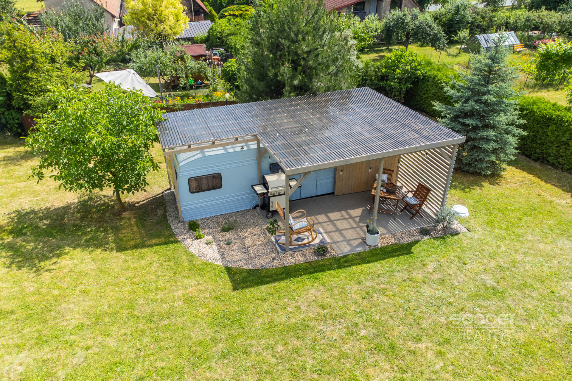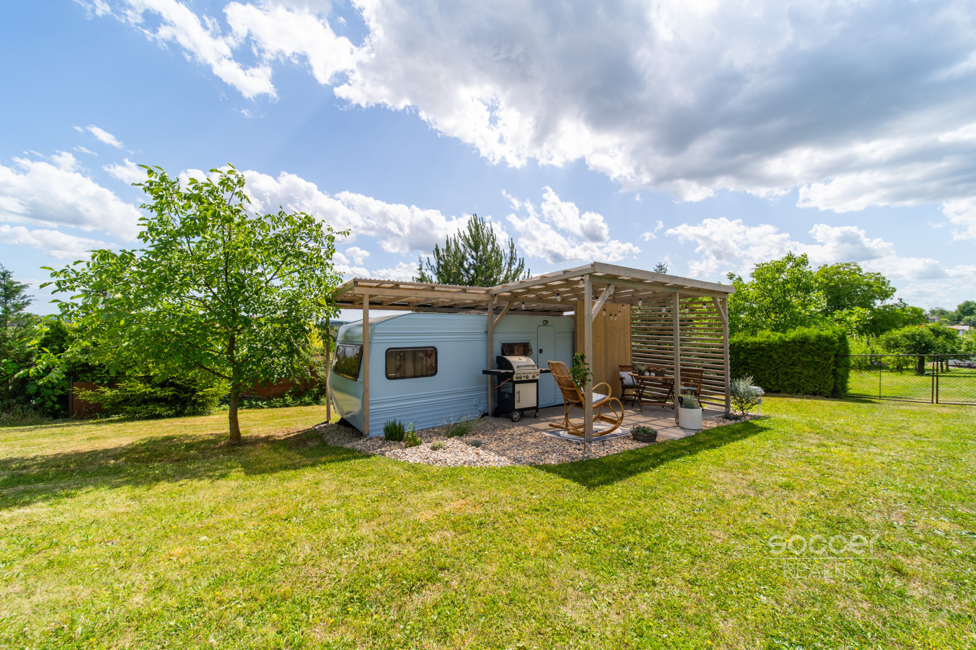 Rekreační karavan zajišťuje útulné zázemí a je vybaven nábytkem. Má sociální zařízení (chemická toaleta a sprcha jsou umístěny v přístřešku), je napojen na pitnou vodu i elektřinu (možnost umístit si např. i průtokový ohřívač vody). K dispozici je také plynový gril. Pro údržbu je zajištěn zahradní traktůrek a základní náčiní. Zahrada je kompletně oplocená (pod uzamčením) a parkovat je možné na oploceném pozemku.